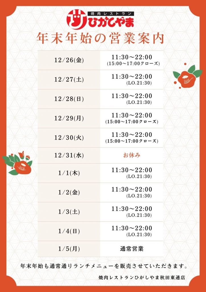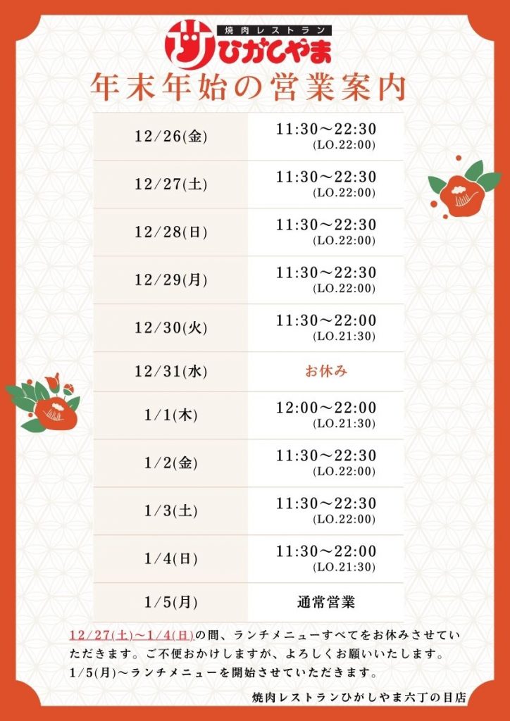 ☆焼肉レストランひがしやま 営業時間について☆